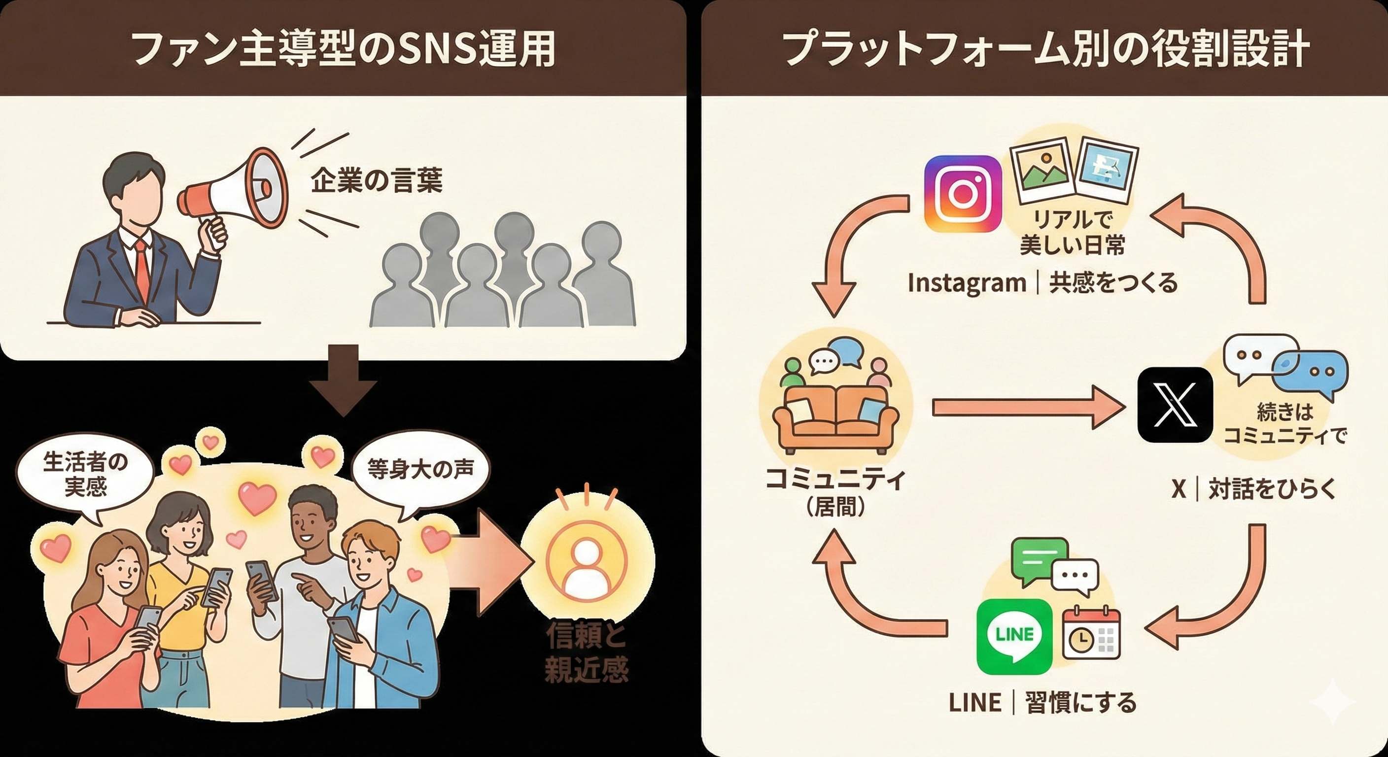 - •SNSは「広場(拡散・話題化)」、コミュニティは「居間(定着・共創)」と定義し、相互送客する「循環」を設計する